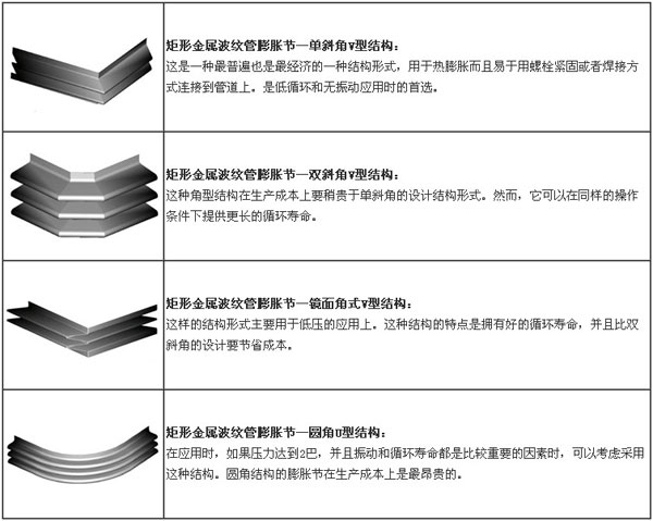 矩形金屬波紋管膨脹節角結構形式:用途(tu)和工作(zuo)條(tiao)件將決定正確的(de)矩形金屬膨脹(zhang)節(jie)的(de)結構和角的(de)結構形式。低(di)壓環境(jing)條(tiao)件下(xia)可以用V型角結構的(de)矩形金屬膨脹(zhang)節(jie)。高壓環境(jing)條(tiao)件下(xia)應(ying)用U型結構的(de)最合(he)適。