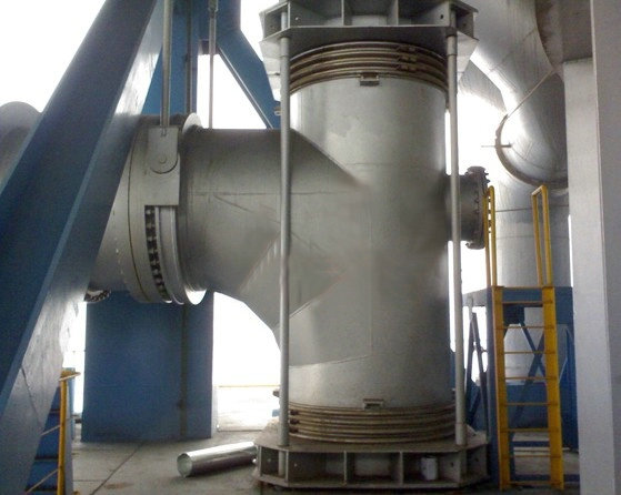 如(ru)圖(tu)所示,如(ru)果系統中的橫(heng)向位移超過了曲管壓力平衡式波紋管膨脹節的(de)(de) 補償能力(li),就(jiu)會產生(sheng)其它一些安裝(zhuang)方法。使用通用型曲(qu)管(guan)(guan)壓(ya)力(li)平(ping)衡式波(bo)紋膨脹節則便有效(xiao)的(de)(de)解決了這一問題。波(bo)紋管(guan)(guan)(A1)和(A2)用中間接(jie)管(guan)(guan)連接(jie),可以(yi)吸(xi)(xi)(xi)收(shou) 橫向位移(yi)(yi)(yi)也可以(yi)吸(xi)(xi)(xi)收(shou)系統中的(de)(de)軸向位移(yi)(yi)(yi)。平(ping)衡波(bo)紋管(guan)(guan)B的(de)(de)設計僅用于補償軸向位移(yi)(yi)(yi)。連接(jie)這兩組波(bo)紋管(guan)(guan)的(de)(de)拉桿用于吸(xi)(xi)(xi)收(shou)由于臨(lin)近設備和結構所產生(sheng)的(de)(de)壓(ya)力(li)推力(li)。這中 設計在(zai)渦(wo)輪(lun)機、轉向冷凝器、鍋爐(lu)給水泵以(yi)及其它的(de)(de)循環系統中得到廣泛的(de)(de)應用。